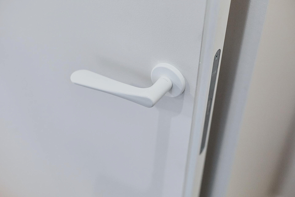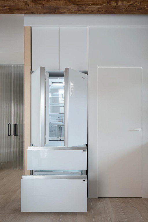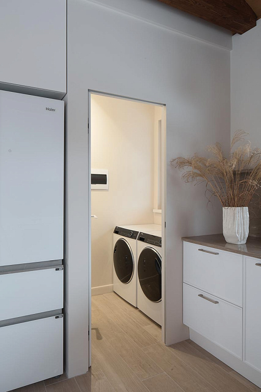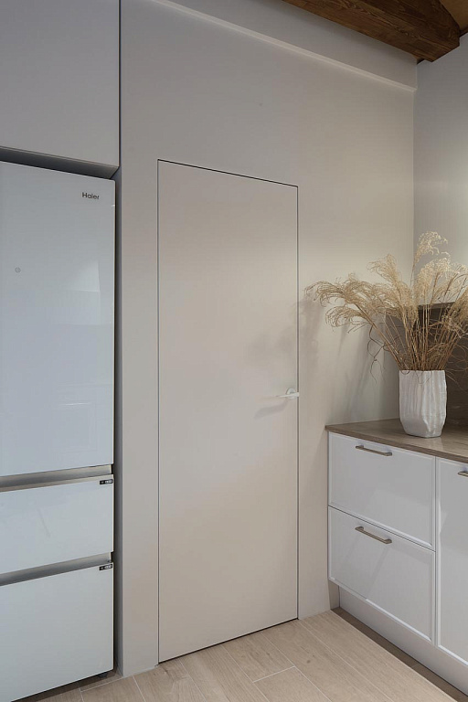 Скрытый короб двери, ведущей в кладовую, изготовлен из цельноалюминиевого профиля без посторонних вставок, что обеспечивает надежность всего блока. На производстве на полотно нанесли два слоя грунта, благодаря чему дверь была полностью подготовлена к чистовой отделке.