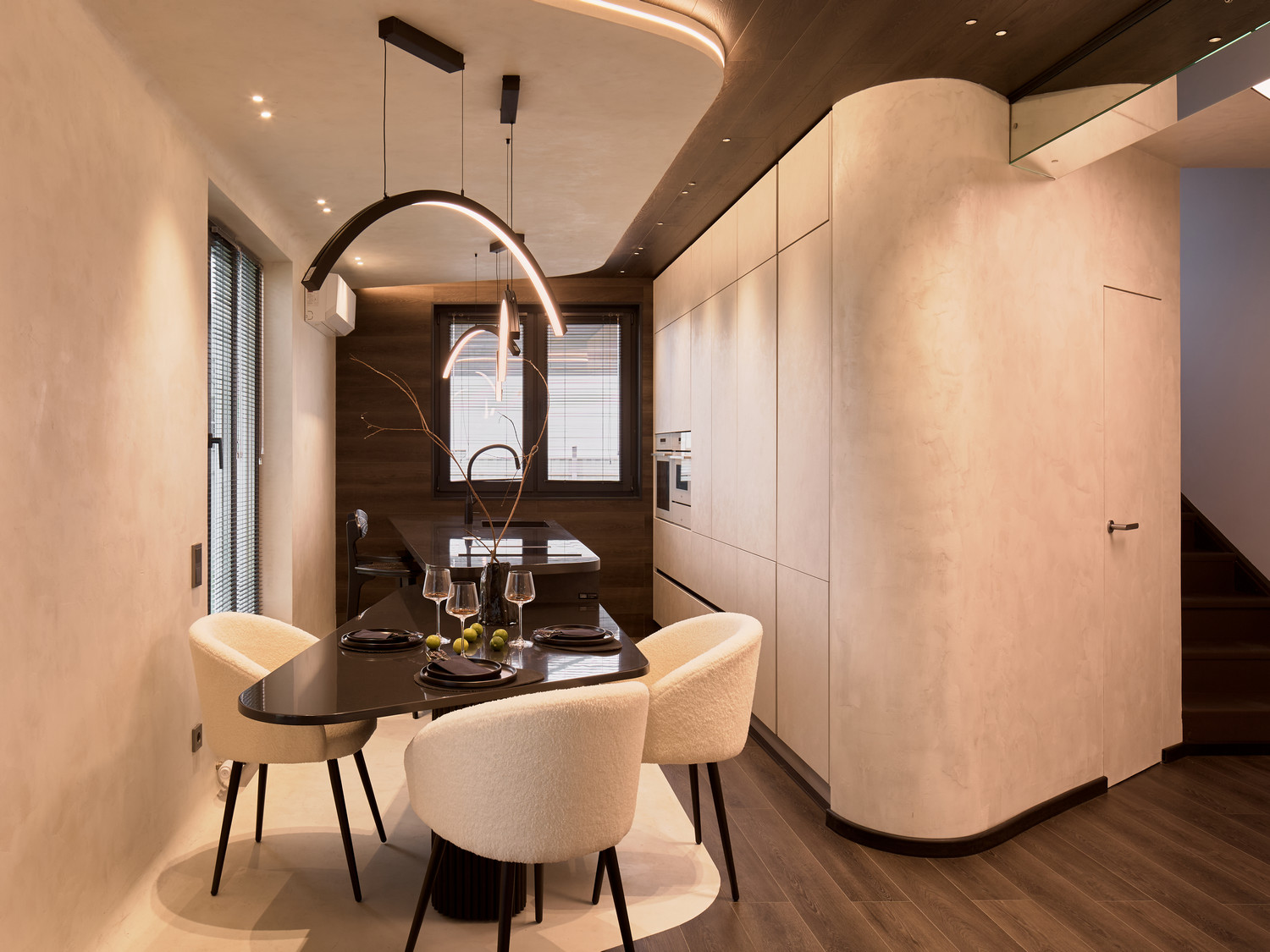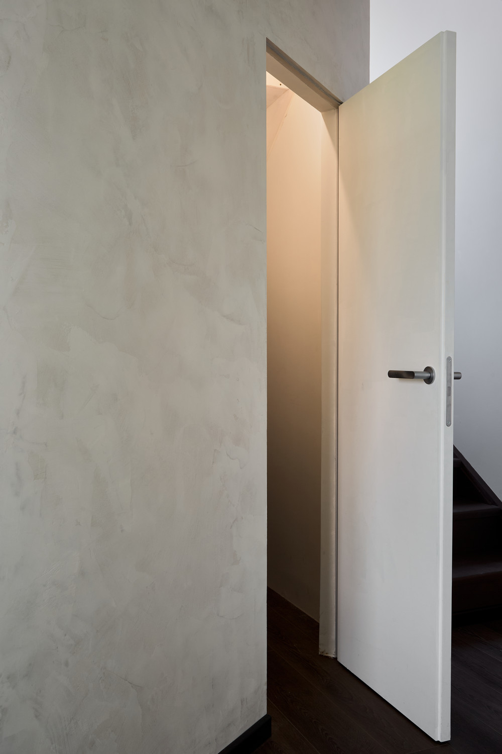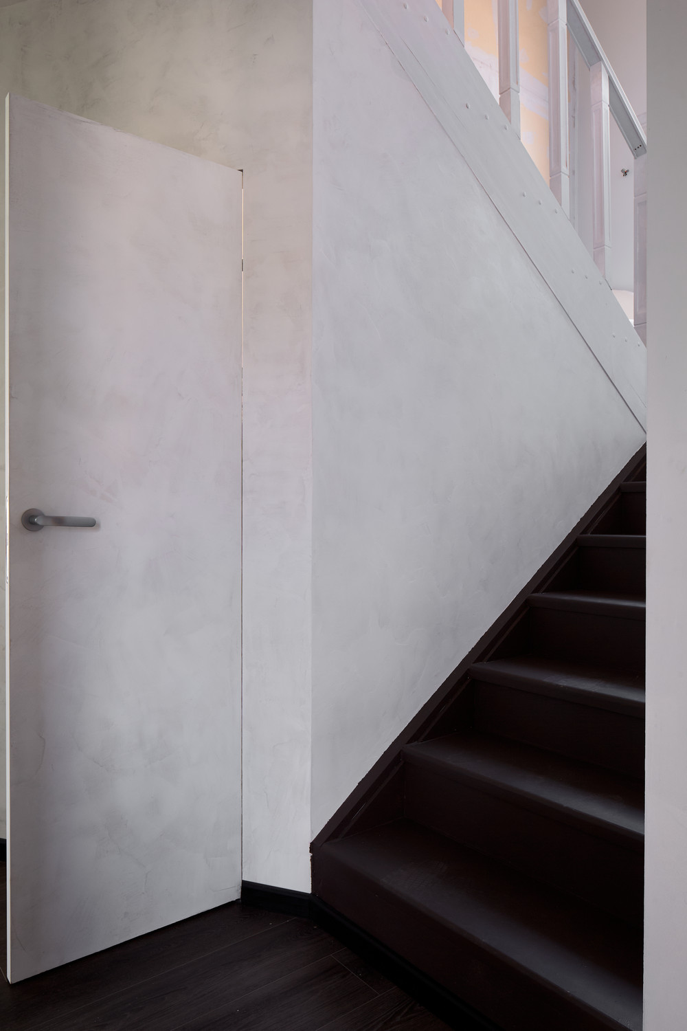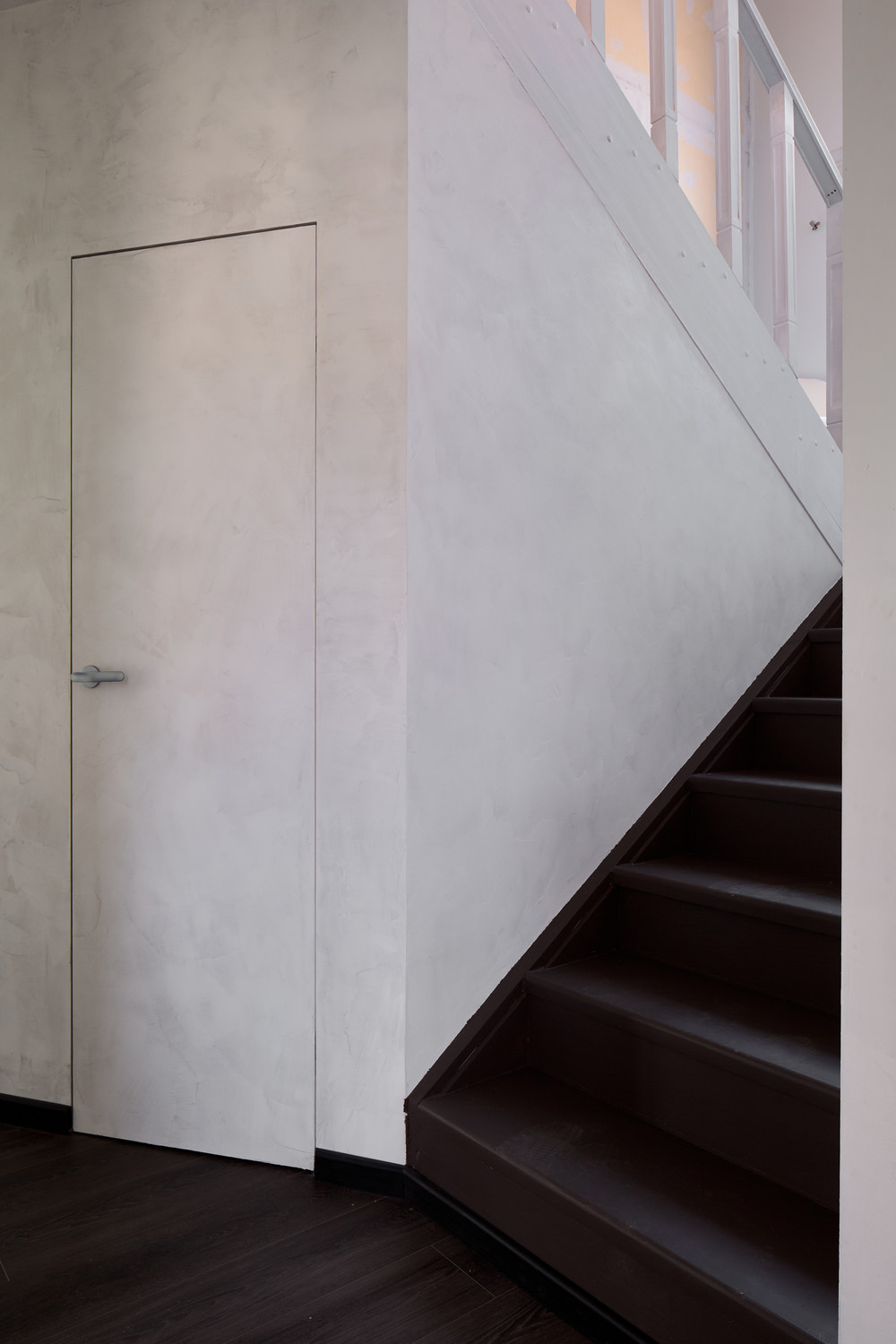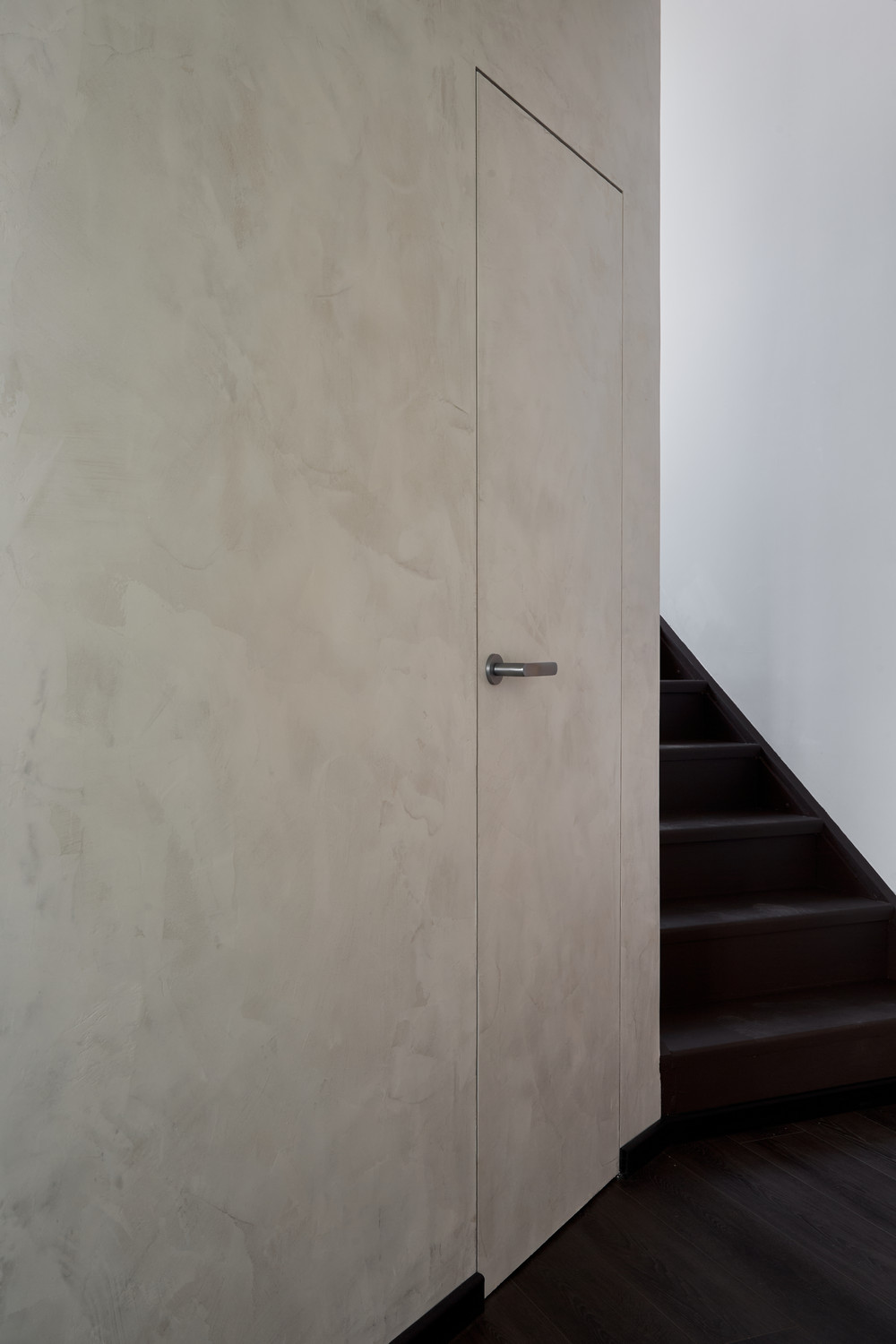 Пространство под лестницей превратили в багажный отсек с отдельным входом. Для этого выстроили стены и установили дверь в скрытом коробе. Он из анодированного алюминия, устойчивого к механическим повреждениям и коррозии.