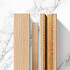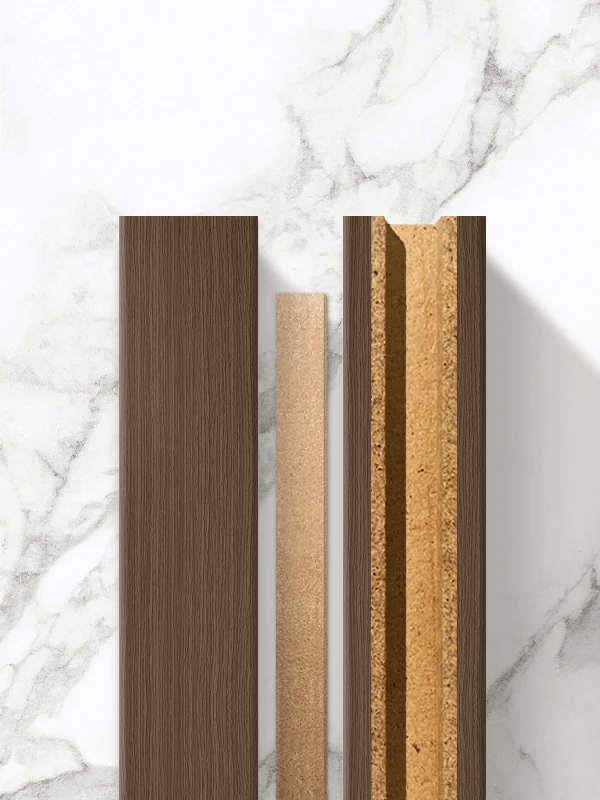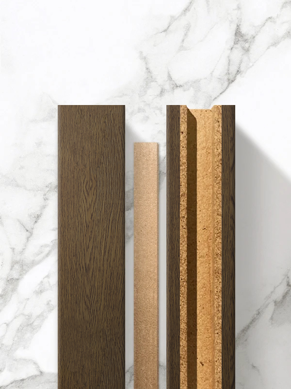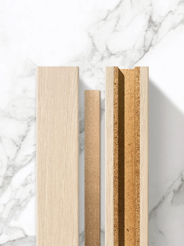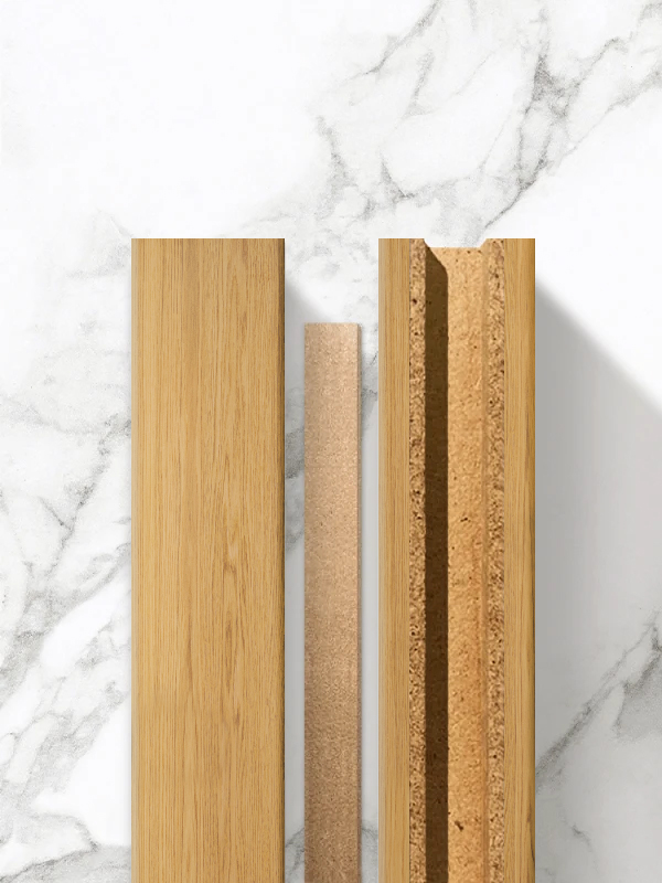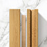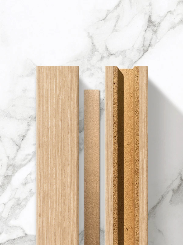 Реечные панели с пазом представляют собой параллелепипеды, которые покрыты натуральным шпоном дуба (натуральный, натуральный без отделки, матовый лак). Материал изготовления — МДФ.