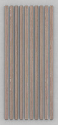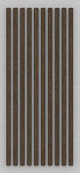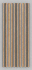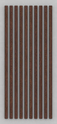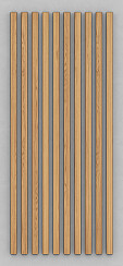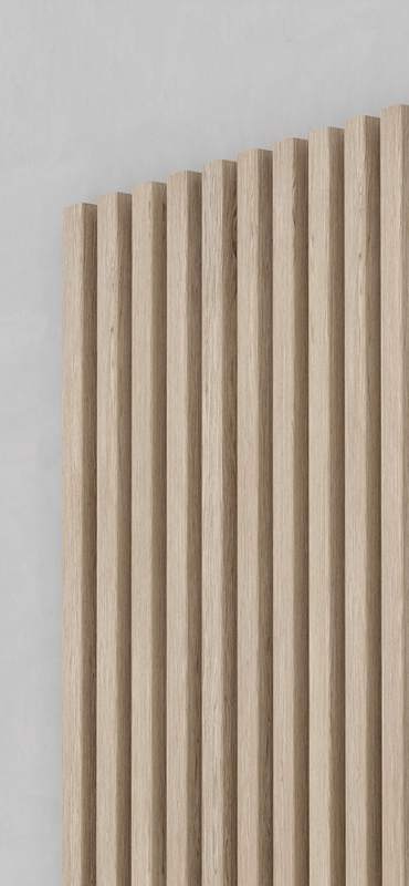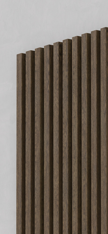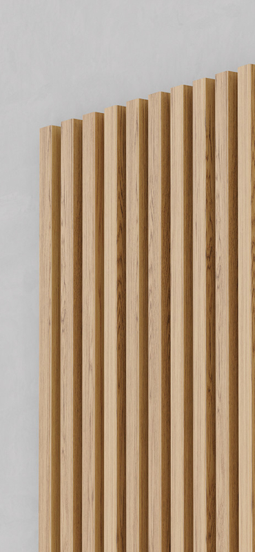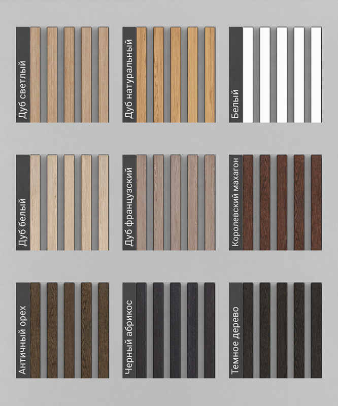 Реечные панели с пазом представляют собой параллелепипеды, которые покрыты натуральным шпоном дуба (натуральный, натуральный без отделки, матовый лак). Материал изготовления — МДФ.