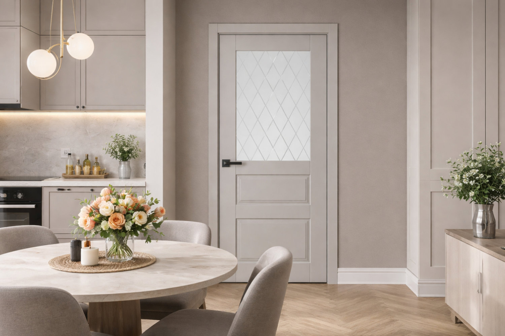 Стекло: витражное стекло Мателюкс белого цвета с матовым эффектом сохраняет приватность в комнате, пропуская при этом свет.