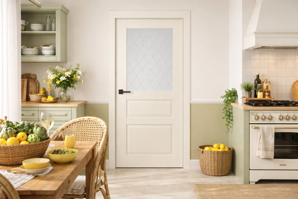 Стекло: витражное стекло Мателюкс белого цвета с матовым эффектом сохраняет приватность в комнате, при этом наполняя ее светом.