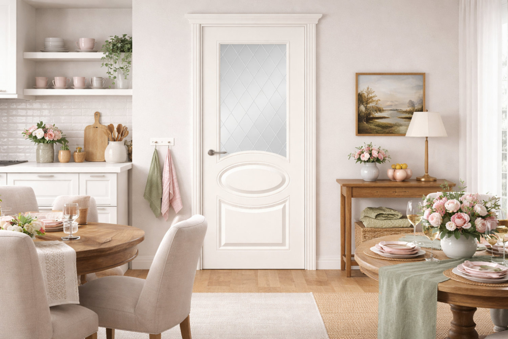 Стекло: витражное стекло Мателюкс белого цвета с матовым эффектом сохраняет приватность в комнате, при этом наполняя ее светом.