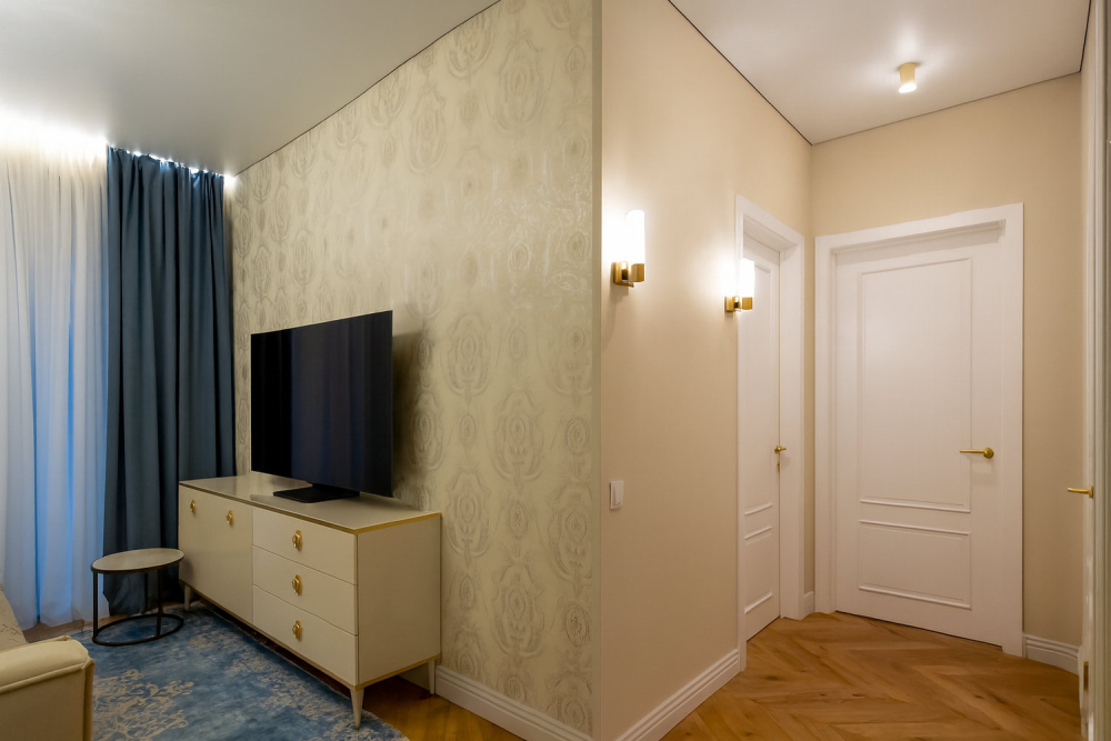 Это наличник, который образует единую плоскость со стеной и дверью. Такое решение создаёт стильный минималистичный дизайн. В то же время обеспечивается экономия пространства, так как с наружной стороны дверь можно открыть полностью. Наружный наличник-компланар представляет собой накладную планку Г-образной формы, где короткая сторона соприкасается с торцом дверного полотна, а длинная прилегает к стене. С внутренней стороны дверей можно использовать телескопические наличники.