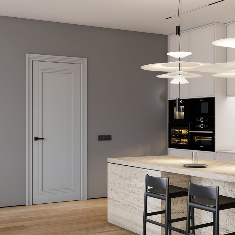 Современный дизайн: граничащая между модерном и неоклассикой межкомнатная дверь Левел 1 украшена глубокой ступенчатой фрезеровкой, которая будет эффектно смотреться в любом интерьере.