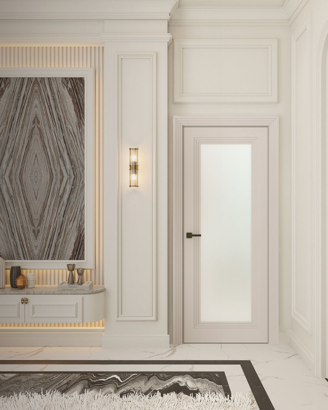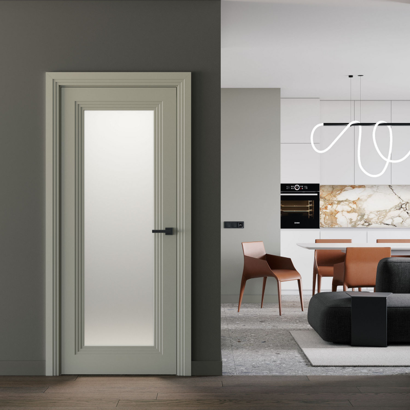 Современный дизайн: граничащая между модерном и неоклассикой межкомнатная дверь Левел 1 украшена стеклянной вставкой и глубокой ступенчатой фрезеровкой, которые вместе будут эффектно смотреться в любом интерьере, слегка наполняя его светом и визуально расширяя пространство.