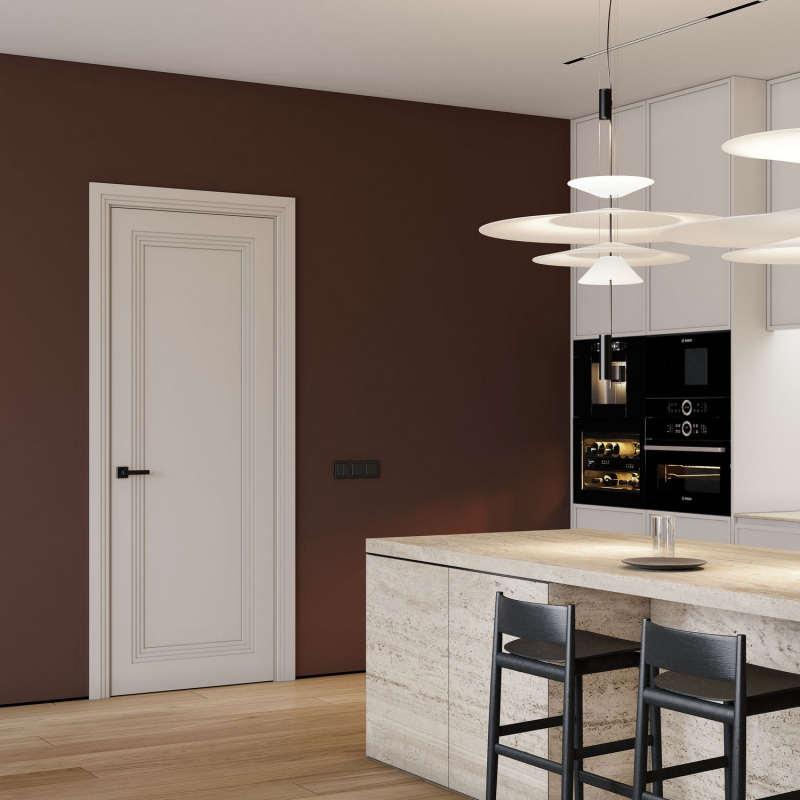 Современный дизайн: граничащая между модерном и неоклассикой межкомнатная дверь Левел 1 украшена глубокой ступенчатой фрезеровкой, которая будет эффектно смотреться в любом интерьере.
