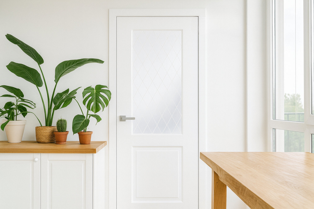 Стекло: витражное стекло Мателюкс белого цвета с матовым эффектом сохраняет приватность в комнате, при этом наполняя ее светом.