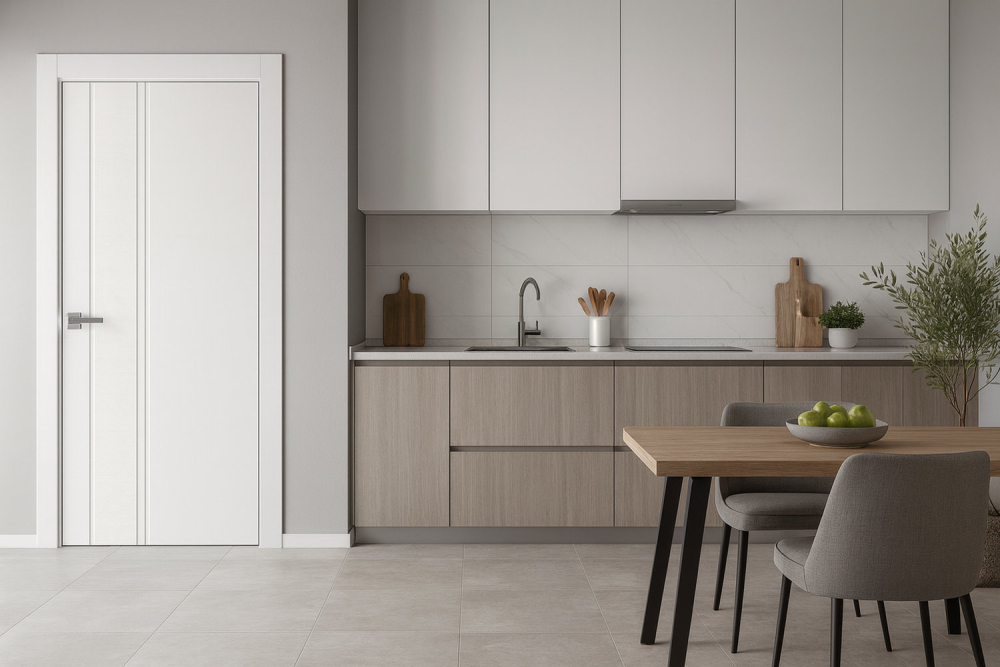 Это наличник, который образует единую плоскость со стеной и дверью. Такое решение создаёт стильный минималистичный дизайн. В то же время обеспечивается экономия пространства, так как с наружной стороны дверь можно открыть полностью. Наружный наличник-компланар представляет собой накладную планку Г-образной формы, где короткая сторона соприкасается с торцом дверного полотна, а длинная прилегает к стене. С внутренней стороны дверей можно использовать телескопические наличники.