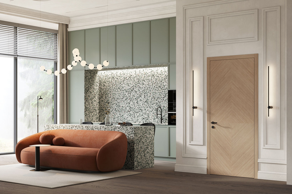 Наполнение: Smart Core — это инновационный, запатентованный заводом Belwooddoors экологически чистый материал из древесных волокон, который отвечает за звукоизоляцию и сохранение тепла внутри комнаты.