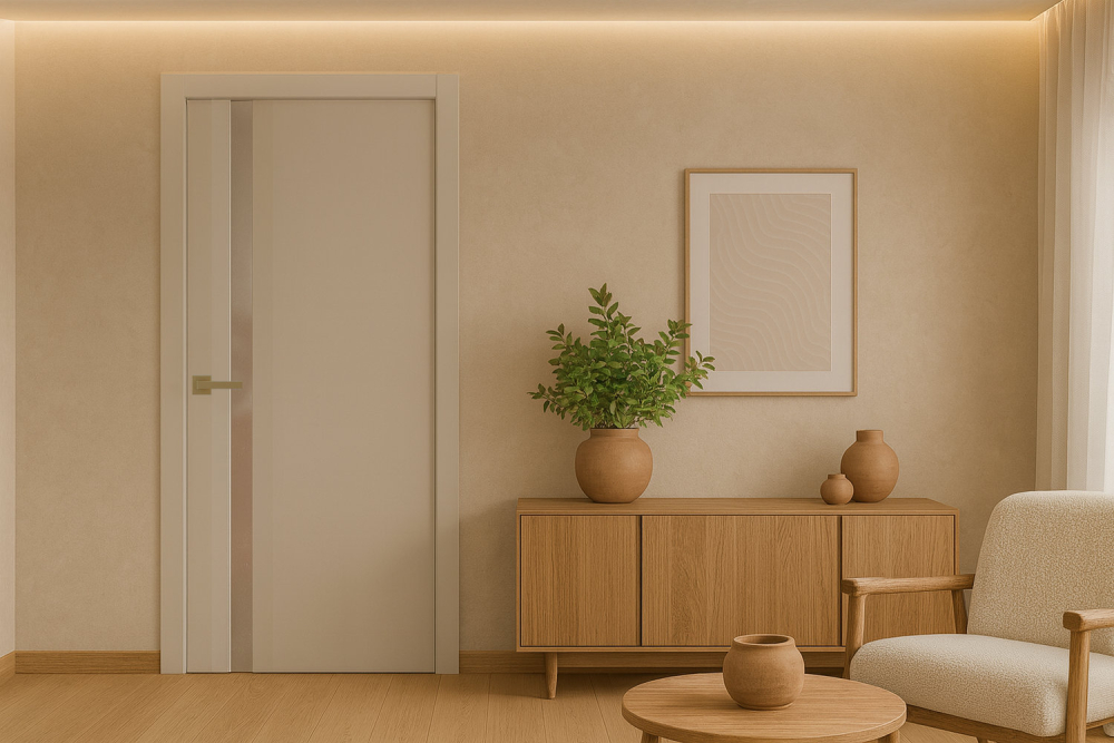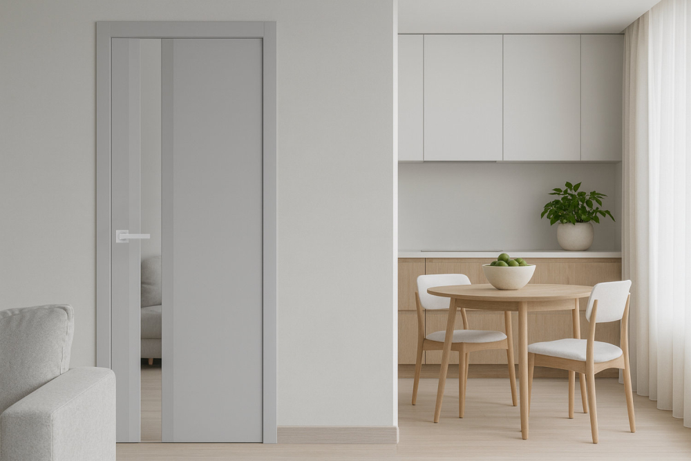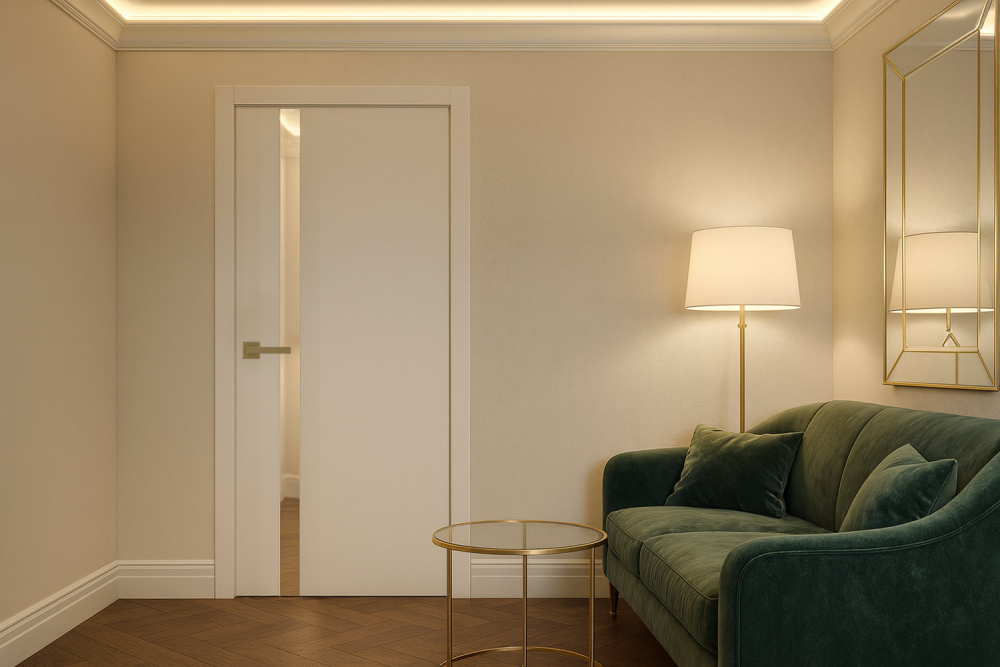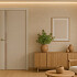 Это наличник, который образует единую плоскость со стеной и дверью. Такое решение создаёт стильный минималистичный дизайн. В то же время обеспечивается экономия пространства, так как с наружной стороны дверь можно открыть полностью. Наружный наличник-компланар представляет собой накладную планку Г-образной формы, где короткая сторона соприкасается с торцом дверного полотна, а длинная прилегает к стене. С внутренней стороны дверей можно использовать телескопические наличники.